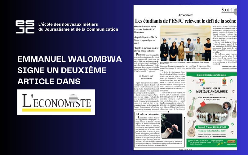 La publication de ce nouveau papier dans L’Économiste illustre l’une des spécificités de l’ESJC : évoluer au sein d’un écosystème médiatique réel, adossé au groupe L’Économiste. Cette proximité avec une rédaction professionnelle offre aux étudiants une opportunité précieuse : confronter très tôt leur travail aux exigences du métier, affiner leur écriture journalistique et comprendre les standards éditoriaux d’un média reconnu.